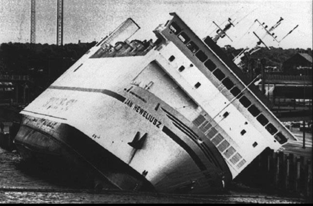 Choćby co do zdarzenia z 19 sierpnia 1982 r., którego widać na archiwalnym zdjęciu powyżej. „Jan Heweliusz” podczas wyładunku wagonów, przechylił się i osiadł na dnie przy nabrzeżu w Ystad, opierając się lewą burtą o keję.